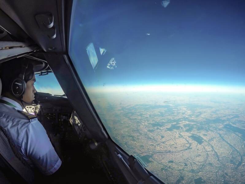 Paris Panoramique - A speech to our passengers over the PA system, to tell them we're currently right overhead the French capital Paris, along the banks of the River Seine. Even from 38,000 feet the city looks stunning and one can clearly see its most famous landmark, the Eiffel Tower, protruding from La Rive Gauche or the Left Bank. Can you spot the Arc de Triomph and the La Défense business district?
