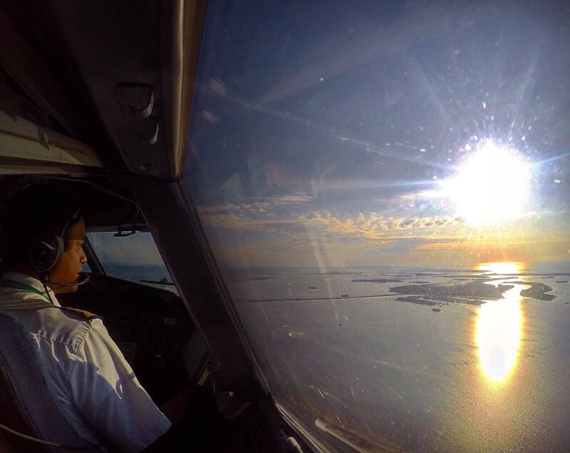 Buongiorno Venezia - early arrival at Marco Polo Int'l airport, the morning sun rising over the famous city, reflecting in a golden Canale Giudecca